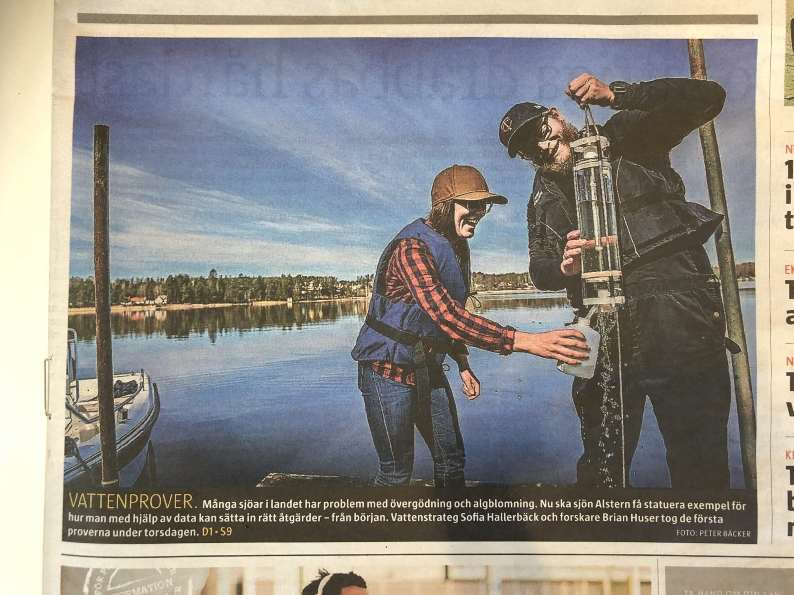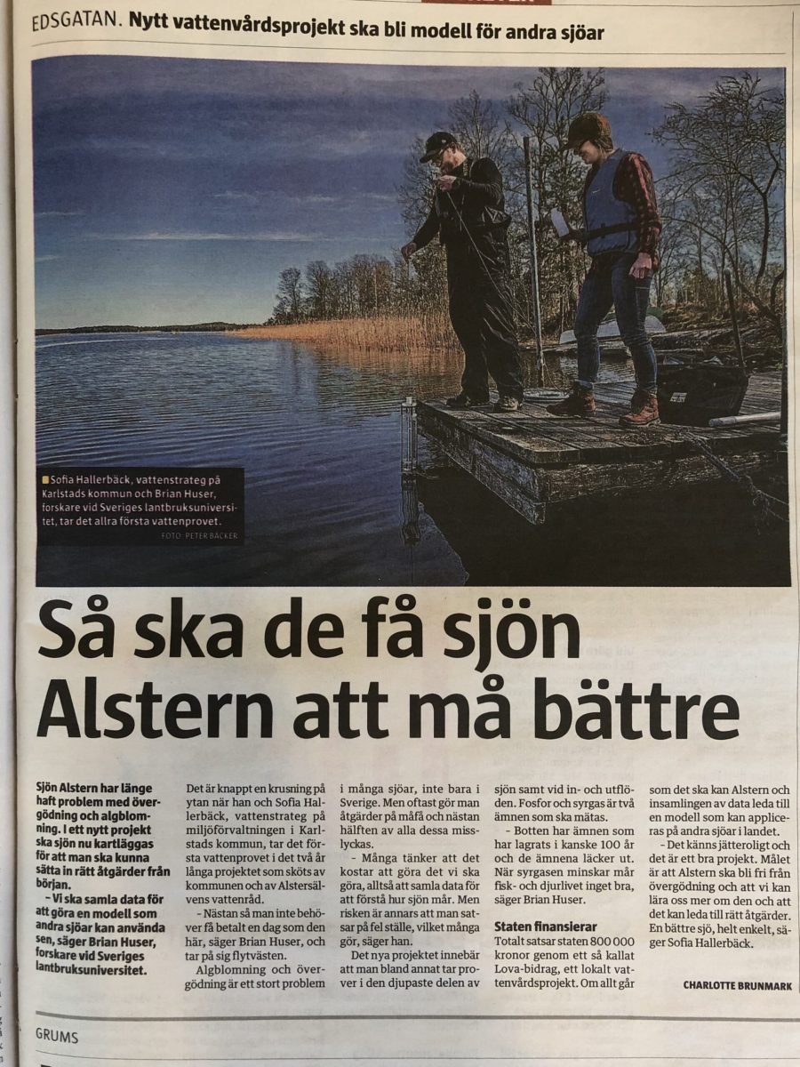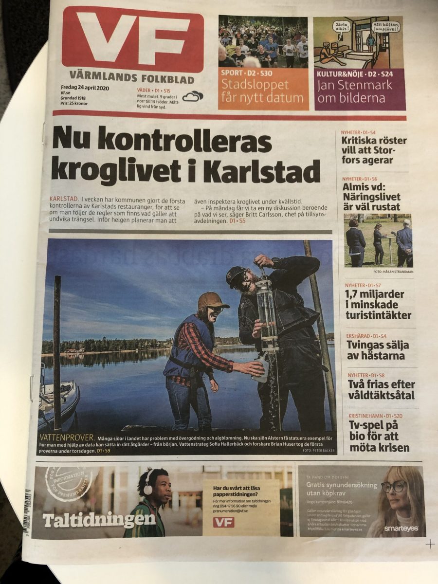 Instrument och utrustning installerades och första provtagning utfördes i onsdagen den 22 april i in- och utflöden och torsdagen den 23 april i den djupaste delen av sjön.Under första provtagningsveckan fick vi besök av VF, SVT Värmland och P4 Värmland. Det blev en förstasida i VF på fredagen och en intervju på SVT Nyheter. NWT ringde också och projektet uppmärksammades i en artikel i NWT på lördagen. Väldigt roligt att projektet uppmärksammas!